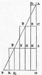 | Dove mi figuro per la linea AI la continuazione del tempo dopo il primo instante in A; applicando poi in A, secondo qualsivoglia angolo, la retta AF, e congiugnendo i termini I, F, diviso il tempo AI in mezo in C, tiro la CB parallela alla IF;considerando poi la CB come grado massimo della velocità che, cominciando dalla quiete nel primo instante del tempo A, si andó augumentando secondo il crescimento delle parallele alla BC, {30} prodotte nel triangolo ABC (che è il medesimo che crescere secondo che cresce il tempo), ammetto senza controversia, per i discorsi fatti sin qui, che lo spazio passato dal mobile cadente con la velocità accresciuta nel detto modo sarebbe eguale allo spazio che passerebbe il {211} medesimo mobile quando si fusse nel medesimo tempo AC mosso di moto uniforme, il cui grado di velocità fusse eguale all'EC, metà del BC.Passo ora più oltre, e figuratomi, il mobile sceso con moto accelerato trovarsi nell'instante C avere il grado di velocità BC, è manifesto, che se egli continuasse di muoversi con l'istesso grado di velocità BC senza più accelerarsi, passerebbe nel seguente tempo CI spazio doppio di quello che ei passó {10} nell'egual tempo AC col grado di velocità uniforme EC, metà del grado BC;ma perché il mobile scende con velocità accresciuta sempre uniformemente in tutti i tempi eguali, aggiugnerà al grado CB nel seguente tempo CI quei momenti medesimi di velocità crescente secondo le parallele del triangolo BFG, eguale al triangolo ABC:sì che, aggiunto al grado di velocità GI la metà del grado FG, massimo degli acquistati nel moto accelerato e regolati {20} dalle parallele del triangolo BFG, aremo il grado di velocità IN, col quale di moto uniforme si sarebbe mosso nel tempo CI; il qual grado IN essendo triplo del grado EC, convince, lo spazio passato nel secondo tempo CI dovere esser triplo del passato nel primo tempo CA.E se noi intenderemo, esser aggiunta all'AI un'altra ugual parte di tempo IO, ed accresciuto il triangolo sino in APO, è manifesto, che quando si continuasse il moto per tutto 'l tempo IO col grado di velocità IF, acquistato nel moto accelerato nel tempo AI, essendo tal grado IF quadruplo dell'EC, lo spazio passato nel tempo IO sarebbe quadruplo del passato nell'egual primo tempo AC; ma {30} continuando l'accrescimento dell'uniforme accelerazione nel triangolo FPQ simile a quello del triangolo ABC, che ridotto a moto equabile aggiugne il grado eguale all'EC, aggiunto il QR eguale all'EC, aremo tutta la velocità equabile esercitata nel tempo IO quintupla dell'equabile del primo tempo AC, e peró lo spazio passato quintuplo del passato nel primo tempo AC.Vedesi dunque anco in questo semplice calcolo, gli spazii passati in tempi uguali dal mobile che, partendosi dalla quiete, va acquistando velocità conforme all'accrescimento del {212} tempo, esser tra di loro come i numeri impari ab unitate 1, 3, 5, e, congiuntamente presi gli spazii passati, il passato nel doppio tempo esser quadruplo del passato nel sudduplo, il passato nel tempo triplo esser nonuplo, ed in somma gli spazii passati essere in duplicata proporzione de i tempi, cioè come i quadrati di essi tempi. | Let the line AI represent the lapse of time measured from the initial A; through A draw the straight line AF making any angle whatever; join the terminal points I and F; divide the time AI in half at C; draw CB parallel to IF. Let us consider CB as the maximum value of the velocity which increases from zero at the beginning, in simple proportionality to the intercepts on the triangle ABC of lines drawn parallel to BC; or what is the same thing, let us suppose the velocity to increase in proportion to the time; then I admit without question, in view of the preceding argument, that the space described by a body falling in the aforesaid manner will be equal to the space traversed by the same body during the same length of time travelling with a uniform speed equal to EC, the half of BC.Further let us imagine that the {211} body has fallen with accelerated motion so that, at the instant C, it has the velocity BC. It is clear that if the body continued to descend with the same speed BC, without acceleration, it would in the next time-interval CI traverse double the distance covered during the interval AC, with the uniform speed EC which is half of BC; but since the falling body acquires equal increments of speed during equal increments of time, it follows that the velocity BC, during the next time-interval CI will be increased by an amount represented by the parallels of the triangle BFG which is equal to the triangle ABC. If, then, one adds to the velocity GI half of the velocity FG, the highest speed acquired by the accelerated motion and determined by the parallels of the triangle BFG, he will have the uniform velocity with which the same space would have been described in the time CI; and since this speed IN is three times as great as EC it follows that the space described during the interval CI is three times as great as that described during the interval AC.Let us imagine the motion extended over another equal time-interval IO, and the triangle extended to APO; it is then evident that if the motion continues during the interval IO, at the constant rate IF acquired by acceleration during the time AI, the space traversed during the interval IO will be four times that traversed during the first interval AC, because the speed IF is four times the speed EC. But if we enlarge our triangle so as to include FPQ which is equal to ABC, still assuming the acceleration to be constant, we shall add to the uniform speed an increment RQ, equal to EC; then the value of the equivalent uniform speed during the time-interval IO will be five times that during the first time-interval AC; therefore the space traversed will be quintuple that during the first interval AC.It is thus evident by simple computation that a moving body starting from rest and acquiring velocity at a rat