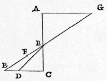 | Sit datum perpendiculum AB, cui, extenso in C, ponatur pars BC {10} aequalis, et ducantur horizontales CE, AG: oportet, ex B planum usque ad horizontem CE inflectere, in quo fiat motus post casum ex A eodem tempore, ac in AB ex quiete in A. Ponatur CD aequalis CB, et ducta BD, applicetur BE aequalis utrisque BD, DC: dico, BE esse planum quaesitum. Producatur EB, occurrens horizonti AG in G, et ipsarum EG, GB media sit GF; erit EF ad FB ut EG ad GF, et quadratum EF ad quadratum FB ut quadratum EG ad quadratum GF, hoc est {20} ut linea EG ad GB: est autem EG dupla GB: ergo quadratum EF duplum quadrati FB. Verum quadratum quoque DB duplum est quadrati BC; ergo ut linea EF ad FB, ita DB ad BC, et, componendo et permutando, ut EB ad duas DB, BC, ita BF ad BC: sed BE duabus DB, BC est aequalis: ergo BF ipsi BC, seu BA aequalis est. Si igitur intelligatur, AB esse tempus casus per AB, erit GB tempus per GB, et GF tempus per totam GE; ergo BF erit tempus per reliquam BE post casum ex G, seu ex A: quod erat propositum. | Let AB denote the given perpendicular: prolong this line to C making BC equal to AB, and draw the horizontal lines CE and AG. It is required to draw a plane from B to the horizontal line CE such that after a body starting from rest at A has fallen through the distance AB, it will complete its path along this plane in an equal time. Lay off CD equal to BC, and draw the line BD. Construct the line BE equal to the sum of BD and DC; then, I say, BE is the required plane. Prolong EB till it intersects the horizontal AG at G. Let GF be a mean proportional between GE and GB; then EF:FB = EG:GF, and EF^2:FB^2= EG^2:GF^2 = EG:GB. But EG is twice GB; hence the square of EF is twice the square of FB; so also is the square of DB twice the square of BC. Consequently EF:FB = DB:BC, and componendo et permutando, EB:DB + BC = BF:BC. But EB = DB + BC; hence BF = BC = BA. If we agree that the length AB shall represent the time of fall along the line AB, (Condition 2/03-th-03-cor) then GB will represent the time of descent along GB, (Condition 2/02-th-02-cor2) and GF the time along the entire distance GE; (Condition 2/11-th-11) therefore BF will represent the time of descent along the difference of these paths, namely, BE, after fall from G or from A. Q. E. F. |