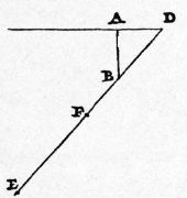 | Sit perpendiculum AB, et ad ipsum planum inflexum BE: oportet, in BE spatium signare, per quod mobile post casum in ab moveatur tempore aequali ei, quo ipsum perpendiculum ab ex quiete confecit. Sit horizontalis linea AD, cui occurrat in D planum extensum, et accipiatur FB aequalis BA, et fiat ut BD ad DF, ita FD ad DE: dico, tempus per BE post casum in AB aequari tempori {20} per AB ex quiete in A. Si enim intelligatur, AB esse tempus per AB, erit DB tempus per DB; cumque sit ut BD ad DF, ita FD ad DE, erit DF tempus per totum planum DE, et BF per partem BE ex D: sed tempus per BE post DB est idem ac post AB: ergo tempus per BE post AB erit BF, aequale scilicet tempori AB ex quiete in A: quod erat propositum. | Let AB be the vertical line and BE the inclined plane. The problem is to determine on BE a distance such that a body, after falling through AB, will traverse it in a time equal to that required to traverse the perpendicular AB itself, starting from rest. Draw the horizontal AD and extend the plane until it meets this line in D. Lay off FB equal to BA; and choose the point E such that BD:FD = DF:DE. Then, I say, the time of descent along BE, after fall through AB, is equal to the time of fall, from rest at A, through AB. For, if we assume that the length AB represents the time of fall through AB, (Condition 2/03-th-03-cor) then the time of fall through DB will be represented by the time DB; and since BD:FD = DF:DE, (Condition 202C) it follows that DF will represent the time of descent along the entire plane DE (Condition 2/11-th-11) while BF represents the time through the portion BE starting from rest at D; but the time of descent along BE after the preliminary descent along DB is the same as that after a preliminary fall through AB. Hence the time of descent along BE after AB will be BF which of course is equal to the time of fall through AB from rest at A. |