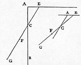 | Infra horizontem AE sit perpendiculum AB, in quo ex principio A fiat casus, cuius sumatur quaelibet pars AC; inde ex C inclinetur {30} utcunque planum CG, super quo post casum in AC continuetur motus: dico, quod {239} spatium tali motu peractum per CG in tempore aequali tempori casus per AC, est plus quam duplum, minus vero quam triplum, eiusdem spatii AC. Ponatur enim CF aequalis AC, et extenso plano GC usque ad horizontem in E, fiat ut CE ad EF, ita FE ad EG. Si itaque ponatur, tempus casus per AC esse ut linea AC, erit CE tempus per EC, et CF, seu CA, tempus motus per CG: ostendendum itaque est, spatium CG ipsius CA maius esse quam duplum, minus vero quam triplum. Cum enim sit ut CE ad EF, ita FE ad EG, erit etiam ita CF ad FG; minor autem est EC quam EF; quare et CF minor erit quam FG, et GC maior quam dupla ad FC, seu AC. Cumque {10} rursus FE minor sit quam dupla ad EC (est enim EC maior CA, seu CF), erit quoque GF minor quam dupla ad FC, et GC minor quam tripla ad CF, seu CA: quod erat demonstrandum. Poterat autem universalius idem proponi: quod enim accidit in perpendiculari et plano inclinato, contingit etiam si post motum in plano quodam inclinato inflectatur per magis inclinatum, ut videtur in altera figura; eademque est demonstratio. | Let AB be a vertical line drawn downwards from the horizontal line AE, and let it represent the path of a body falling from rest at A; choose any portion AC of this path.Through C draw any inclined plane, CG, along which the motion is continued after fall through AC. Then, I say, that the distance {239} traversed along this plane CG, during the time-interval equal to that of the fall through AC, is more than twice, but less than three times, this same distance AC.Let us layoff CF equal to AC, and extend the plane GC until it meets the horizontal in E; choose G such that CE:EF = EF:EG. If now we assume that the time of fall along AC is represented by the length AC, (Condition 2/03-th-03-cor) then CE will represent the time of descent along CE, (Condition 2/11-th-11) while CF, or CA, will represent the time of descent along CG. It now remains to be shown that the distance CG is more than twice, and less than three times, the distance CA itself. Since CE:EF = EF:EG, it follows that CE:EF = CF:FG; but EC |