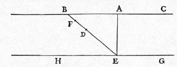 | {30} Inter easdem parallelas horizontales BC, HG sint perpendiculum AE et planum elevatum EB, super quo, post casum in perpendiculo AE, ex termino E fiat reflexio versus B: dico, spatium per quod mobile ascendit in tempore aequali tempori descensus AE, maius esse quam AE, minus vero quam duplum eiusdem AE. Ponatur ED ipsi AE aequale, et ut EB ad BD, ita fiat DB ad BF; ostendetur, primo, punctum F esse signum, {246} quo mobile motu reflexo per EB perveniet tempore aequali tempori AE; deinde, EF maius esse quam EA, minus vero quam duplum eiusdem. Si intelligamus, tempus descensus per AE esse ut AE, erit tempus descensus per BE, seu ascensus per EB, ut ipsa linea BE; cumque DB media sit inter EB, BF, sitque BE tempus descensus per totam BE, erit BD tempus descensus per BF , et {10} reliqua DE tempus descensus per reliquam FE: verum idem est tempus per FE ex quiete in B, atque tempus ascensus per EF, dum in E fuerit velocitatis gradus per descensum BE, seu AE, acquisitus: ergo idem tempus DE erit id in quo mobile, post casum ex A per AE, motu reflexo per EB, pervenit ad signum F; positum autem est, ED esse aequale ipsi AE: quod erat primo ostendendum. Et quia, ut tota EB ad totam BD, ita ablata DB ad ablatam BF, erit ut tota EB ad totam BD, ita reliqua ED ad DF: est autem EB maior BD: ergo et ED maior DF, et EF minor quam dupla DE, seu AE: quod erat ostendendum. Idem autem accidet si motus praecedens, non in perpendiculo, sed in plano inclinato, fiat; eademque est {20} demonstratio, dummodo planum reflexum sit minus acclive, nempe longius plano declivi. | Let BC and HG be the two horizontal planes, connected by the perpendicular AE; also let EB represent the inclined plane along which the motion takes place after the body has fallen along AE and has been reflected from E towards B. Then, I say, that, during a time equal to that of fall along AE, the body will ascend the inclined plane through a distance which is greater than AE but less than twice AE. Lay off ED equal to AE and choose F so that EB:BD = BD:BF. First we shall {246} show that F is the point to which the moving body will be carried after reflection from E towards B during a time equal to that of fall along AE; and next we shall show that the distance EF is greater than EA but less than twice that quantity. Let us agree to represent the time of fall along AE by the length AE, (Condition 303C) then the time of descent along BE, (Condition 2/23-pr-09-schol7) or what is the same thing, ascent along EB will be represented by the distance EB. Now, since DB is a mean proportional between EB and BF, and since BE is the time of descent for the entire distance BE, (Condition 2/02-th-02-cor2) it follows that BD will be the time of descent through BF, (Condition 2/11-th-11) while the remainder DE will be the time of descent along the remainder FE. (Condition 2/23-pr-09-schol5) But the time of descent along the fall from rest at B is the same as the time of ascent from E to F after reflection from E with the speed acquired during fall either through AE or BE. Therefore DE represents the time occupied by the body in passing from E to F, after fall from A to E and after reflection along EB. But by construction ED is equal to AE. This concludes the first part of our demonstration. Now since the whole of EB is to the whole of BD as the portion DB is to the portion BF, we have the whole of EB is to the whole of BD as the remainder ED is to the remainder DF; but EB>BD and hence ED>DF, and EF is less than twice DE or AE. Q. E. D.The same is true when the initial motion occurs, not along a perpendicular, but upon an inclined plane: the proof is also the same provided the upward sloping plane is less steep, i. e., longer, than the downward sloping plane. |