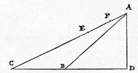 | Sit planum AC longius, AB vero brevius, quorum eadem sit elevatio AD, et ex ima parte AC sumatur CE aequale ipsi AB, et quam rationem habet totum CA ad AE, nempe ad excessum plani CA super AB, hanc {20} habeat CE ad EF: dico, spatium FC esse illud quod conficitur, post discessum ex A, tempore aequali tempori descensus per AB. Cum enim totum CA ad totum AE sit ut ablatum CE ad ablatum EF, erit reliquum EA ad reliquum AF ut totum CA ad totum AE; sunt itaque tres CA, AE, AF continue proportionales: quod si ponatur, tempus per AB esse ut AB, erit tempus per AC ut AC; tempus vero per AF erit ut AE, et per reliquum FC erit ut EC: est autem EC ipsi AB aequale: ergo fit propositum. | Let AC be the longer plane, AB, the shorter, and AD the common elevation; on the lower part of AC lay off CE equal to AB. Choose F such that CA:AE = CA:CA-AB = CE:EF. Then, I say, that FC is that distance which will, after fall from A, be traversed during a time-interval equal to that required for descent along AB. For since CA:AE = CE:EF, it follows that the remainder EA: the remainder AF = CA:AE. Therefore AE is a mean proportional between AC and AF. Accordingly if the length AB is employed to measure the time of fall along AB, (Condition 2/03-th-03-cor) then the distance AC will measure the time of descent through AC; (Condition 2/02-th-02-cor2) but the time of descent through AF is measured by the length AE, (Condition 2/11-th-11) and that through FC by EC. Now EC = AB; and hence follows the proposition. |