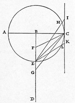 | Sit perpendiculum BD, ex puncto B horizontalis lineae AC descendens, in qua sit quodlibet punctum C, et in perpendiculo ponatur distantia BE {10} aequalis distantiae BC, et ducatur CE: dico, planorum omnium ex puncto C usque ad perpendiculum inclinatorum, CE esse illud super quo tempore omnium brevissimo fit descensus usque ad perpendiculum. Inclinentur enim, supra et infra, plana CF, CG, et ducatur IK, circulum semidiametro BC descriptum tangens in C, quae erit perpendiculo aequidistans; et ipsi CF parallela sit EK, {20} usque ad tangentem protracta, secans circumferentiam circuli in L: constat, tempus casus per LE esse aequale tempori casus per CE: sed tempus per KE est longius quam per LE: ergo tempus per KE longius est quam per CE. Sed tempus per KE aequatur tempori per CF, cum sint aequales et secundum eandem inclinationem ductae; similiter, cum CG et IE sint aequales et iuxta eandem inclinationem inclinatae, tempora lationum per ipsas erunt aequalia: sed tempus per HE, breviorem ipsa IE, {30} est brevius tempore per IE: ergo tempus quoque per CE (quod aequatur tempori per HE) brevius erit tempore per IE. Patet ergo propositum. | Let AC be any horizontal line and B any point in it from which is dropped the vertical line BD. Choose any point C in the horizontal line and lay off, on the vertical, the distance BE equal to BC; join C and E. Then, I say, that of all inclined planes that can be passed through C, cutting the perpendicular, CE is that one along which the descent to the perpendicular is accomplished in the shortest time. For, draw the plane CF cutting the vertical above E, and the plane CG cutting the vertical below E; and draw IK, a parallel vertical line, touching at C a circle described with BC as radius. Let EK be drawn parallel to CF, and extended to meet the tangent, after cutting the circle at L. (Condition 2/06-th-06) Now it is clear that the time of fall along LE is equal to the time along CE; (Condition 2/02-th-02-cor2) but the time along KE is greater than along LE; therefore the time along KE is greater than along CE. But the time along KE is equal to the time along CF, since they have the same length and the same slope; and, in like manner, it follows that the planes CG and IE, having the same length and the same slope, will be traversed in equal times. (Condition 2/02-th-02-cor2) Also, since HE(Condition 2/06-th-06) equal to the time along HE), will be shorter than the time along IE. Q. E. D. |