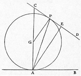 | Sit CD linea supra horizontalem ab utcunque inclinata, datoque in horizontali quocunque puncto A, educantur ex eo AC perpendicularis ad AB, AE vero perpendicularis ad CD, et angulum CAE bifariam dividat FA linea: dico, planorum omnium ex quibuslibet punctis lineae CD ad punctum A inclinatorum, extensum {10} per FA esse in quo, tempore omnium brevissimo fiat descensus. Ducatur FG ipsi AE parallela; erunt anguli GFA, FAE coalterni aequales: est autem EAF ipsi FAG aequalis: ergo trianguli latera FG, GA aequalia erunt. Si itaque centro G, intervallo GA, circulus describatur, transibit per F, et horizontalem et inclinatam tanget in punctis A, F; est enim angulus GFC rectus, cum GF ipsi AE sit aequidistans: ex {20} quo constat, lineas omnes usque ad inclinatam ex puncto A productas extra circumferentiam extendi, et, quod consequens est, lationes per ipsas longiori tempore absolvi quam per FA. Quod erat demonstrandum. | Let CD be a line inclined at any angle to the horizontal AB; and from any assigned point A in the horizontal draw AC perpendicular to AB, and AE perpendicular to CD; draw FA so as to bisect the angle CAE.Then, I say, that of all the planes which can be drawn through the point A, cutting the line CD at any points whatsoever AF is the one of quickest descent [in quo tempore omnium brevissimo fiat descensus]. Draw FG parallel to AE; the alternate angles GFA and FAE will be equal; also the angle EAF is equal to the angle FAG. Therefore the sides GF and GA of the triangle FGA are equal. Accordingly if we describe a circle about G as center, with GA as radius, this circle will pass through the point F, and will touch the horizontal at the point A and the inclined line at F; for GFC is a right angle, since GF and AE are parallel. It is clear therefore that all lines drawn from A to the inclined line, with the single exception of FA, will extend beyond the circumference of the circle, (Condition 2/06-th-06) (Condition 202C) thus requiring more time to traverse any of them than is needed for FA. Q. E. D. |