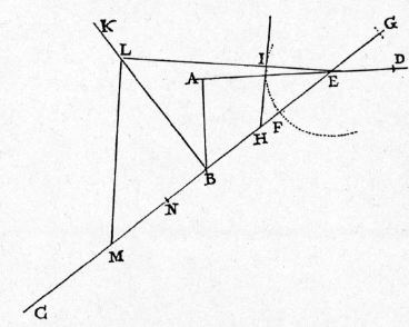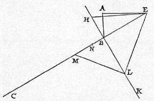| Aliter, magis expedite. Sit BC planum inclinatum, BA perpendiculum. Ducta perpendiculari per B ad EC, et utrinque extensa, ponatur BH aequalis excessui BE super BA, et angulo BHE ponatur aequalis angulus HEL; ipsa vero EL extensa occurrat BK in L, et ex L {20} excitetur perpendicularis ad EL, LM, occurrens BC in M: dico, BM esse spatium in plano BC quaesitum. Quia enim angulus MLE rectus est, erit BL media inter MB, BE, et LE media inter ME, EB, cui EL secetur aequalis EN; et erunt tres lineae NE, EL, LH aequales, et HB erit excessus NE super BL: verum eadem HB est etiam excessus NE super NB, BA: ergo duae NB, BA aequales sunt BL. Quod si ponatur, EB esse tempus per EB, erit BL {30} tempus per BM ex quiete in B, et BN erit tempus eiusdem post EB, seu post AB, et AB erit tempus per AB: ero tempora per ABM, nempe ABN, aequalia sunt tempori per solam BM ex quiete in B: quod est intentum. | Another and shorter proof is the following: Let BC be the inclined plane and BA the vertical; at B draw a perpendicular to EC, extending it both ways; lay off BH equal to the excess of BE over BA; make the angle HEL equal to the angle BHE; prolong EL until it cuts BK in L; at L draw LM perpendicular to EL and extend it till it meets BC in M; then, I say, BM is the portion of BC sought. For, since the angle MLE is a right angle, BL will be a mean proportional between MB and BE, while LE is a mean proportional between ME and BE; lay off EN equal to LE; then NE = EL = LH, and HB = NE-BL. But also HB = NE-(NB+BA); therefore BN+BA = BL. If now we assume the length EB as a measure of the time of descent along EB, (Condition 2/02-th-02-cor2) the time of descent, from rest at B, along BM will be represented by BL; (Condition 2/11-th-11) but, if the descent along BM is from rest at E or at A, then the time of descent will be measured by BN; (Condition 2/03-th-03-cor) and AB will measure the time along AB. Therefore the time required to traverse AB and BM, namely, the sum of the distances AB and BN, is equal to the time of descent, from rest at B, along BM alone. Q. E. F. |
