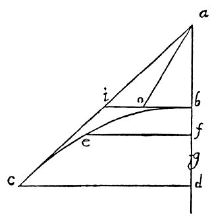 | Sit semiparabola bec, cuius amplitudo cd, altitudo db, quae extensa in sublimi occurrat tangenti parabolam ca in a; et per verticem b sit {30} horizonti et cd parallela bi.Quod si amplitudo cd sit aequalis toti altitudini da, erit bi aequalis ba et bd; et si temporis casus per ab, et momenti velocitatis acquisiti in b per descensum ab ex quiete in a, ponamus mensuram esse ipsammet ab, erit dc (dupla nempe bi) spatium quod per impetum ab, per horizontalem conversum, conficiet eodem tempore: {285} sed eodem tempore cadens per bd ex quiete in b conficit altitudinem bd: ergo mobile cadens ex quiete in a, per ab conversum cum impetu ab, per horizontalem conficit spatium aequale dc.Superveniente vero casu per bd, conficit altitudinem bd, et parabola bc designatur, cuius impetus in termino c est compositus ex aequabili transversali, cuius momentum est ut ab, et ex altero momento acquisito in descensu bd in termino d seu c; quae momenta aequalia sunt.Si ergo intelligamus, ab alterius {10} illorum esse mensuram, ut puta transversalis aequabilis; bi vero, quae ipsi bd est aequalis, esse mensuram impetus acquisiti in d seu c; subtensa ia erit quantitas momenti compositi ex ambobus: erit ergo quantitas seu mensura integri momenti, quo proiectum veniens per parabolam bc impetum facit in c.His retentis, accipiatur in parabola quodlibet punctum e, in quo de impetu proiecti determinandum sit.Ducatur horizontalis ef, et accipiatur bg media proportionalis inter bd, bf: cumque posita sit ab, seu bd, esse mensura temporis et momenti velocitatis in casu bd ex quiete {20} in b, erit bg tempus seu mensura temporis et impetus in f venientis ex b.Si igitur ponatur bo aequalis bg, iuncta diagonalis ao erit quantitas impetus in puncto e: est enim ab determinatrix posita temporis et impetus in b, qui conversus in horizontali semper servatur idem; bo vero determinat impetum in f seu e per descensum ex quiete in b in altitudine bf; his autem ab, bo potentia aequipollet ao.Patet ergo quod quaerebatur. | Let bec be the semi-parabola whose amplitude is cd and whose height is db, which latter extended upwards cuts the tangent of the parabola ca in a. Through the vertex draw the horizontal line bi parallel to cd.Now if the amplitude cd is equal to the entire height da, then bi will be equal to ba and also to bd; and if we take ab as the measure of the time required for fall through the distance ab and also of the momentum acquired at in consequence of its fall from rest at a, then if we turn into a horizontal direction the momentum acquired by fall through ab [impetum ab] (Condition 2/23-pr-09-schol1) the space traversed in the same interval of time will be represented by dc which is twice bi. But a body which falls from rest at b along the line bd will during the same time-interval fall through the height of the parabola {285} bd. Hence a body falling from rest at a, turned into a horizontal direction with the speed ab will traverse a space equal to dc.Now if one superposes upon this motion a fall along bd, traversing the height bd (Condition 3/01-th-01) while the parabola be is described, (Condition 3/04-pr-01-dialog-1) then the momentum of the body at the terminal point c is the resultant of a uniform horizontal momentum, whose value is represented by ab, and of another momentum acquired by fall from b to the terminal point d or c; these two momenta are equal.If, therefore, we take ab to be the measure of one of these momenta, say, the uniform horizontal one, (Condition 3/03-th-02) then bi, which is equal to bd, will represent the momentum acquired at d or c; and ia will represent the resultant of these two momenta, that is, the total momentum with which the projectile, travelling along the parabola, strikes at c.With this in mind let us take any point on the parabola, say e, and determine the momentum with which the projectile passes that point.Draw the horizontal ef and take bg a mean proportional between be and bf. Now since ab, or bd, is assumed to be the measure of the time and of the momentum [momentum velocitatis] acquired by falling from rest at b through the distance bd, (Condition 3/03-th-02) it follows that bg will measure the time and also the momentum [impetus] acquired at f by fall from b.If therefore we lay off bo, equal to bg, (Condition 3/04-pr-01-dialog-1) the diagonal line joining a and o will represent the c momentum at the point e; because the length ab has been assumed to represent the momentum at b which, after diversion into a horizontal direction, remains constant; and because bo measures the momentum at f or e, acquired by fall, from rest at b, through the height bf. But the square of ao equals the sum of the squares of ab and bo.Hence the theorem sought. |