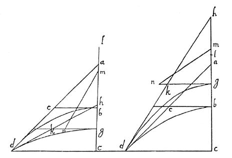 | Sit enim semiparabola bd, cuius amplitudo cd dupla sit altitudinis suae cb, et in axe in sublimi extenso ponatur ba altitudini bc aequalis, et iungatur ad, quae semiparabolam tanget in d et horizontalem be secabit in e, eritque be ipsi bc, seu ba, aequalis: constat, ipsam describi a proiecto, cuius impetus aequabilis horizontalis sit qualis est in b cadentis ex quiete in a, impetus vero naturalis deorsum qualis est venientis in c ex quiete in b; ex quo constat, impetum ex istis compositum, quodque in termino d impingit, esse ut diagonalem ae, potentia nempe ipsis ambobus aequalem.Sit {30} modo quaelibet alia semiparabola gd, cuius amplitudo eadem gd, altitudo {295} vero cg minor vel maior altitudine bc, eamque tangat hd, secans horizontalem per g ductam in punto k; et fiat ut hg ad gk, ita kg ad gl: erit, ex antedemonstratis, altitudo gl, ex qua cadens describet parabolam gd.Inter ab et gl media proportionalis sit gm: erit gm tempus et momentum, sive impetus, in g cadentis ex l (positum enim est, ab esse mensuram temporis et impetus).Sit rursus inter bc, cg media gn, quae erit temporis et impetus mensura cadentis ex g in c.Si igitur iungatur mn, erit ipsa impetus mensura proiecti per parabolam dg, illidentis in termino d: quem quidem impetum, maiorem esse dico impetu proiecti per parabolam bd, cuius {10} quantitas erat ut ae.Quia enim gn posita est media inter bc, cg; est autem bc aequalis be, hoc est kg (est enim unaquaeque subdupla dc); erit ut cg ad gn, ita ng ad gk, et ut cg, seu hg, ad gk, ita quadratum ng ad quadratum gk: ut autem hg ad gk, ita facta est kg ad gl: ergo ut ng ad quadratum gk ita kg ad gl.Sed ut kg ad gl, ita quadratum kg ad quadratum gm; media enim est gm ita kg, gl: ergo tria quadrata ng, kg, gm sunt continue proportionalia, et duo extrema ng, gm simul sumpta, id est quadratum mn, maius quam duplum quadrati kg, cuius quadratum ae duplum est: ergo quadratum mn maius est quadrato ae, et linea mn maior linea ea: quod erat demonstrandum. | Let bd be a semi-parabola whose amplitude cd is double its altitude cb; on its axis extended upwards lay off ba equal to its altitude bc. Draw the line ad which will be a tangent to the parabola at d and will cut the horizontal line be at the point e, making be equal to bc and also to ba. (Condition 304a) It is evident that this parabola will be described by a projectile whose uniform horizontal momentum is that which it would acquire at b in falling from rest at a and whose naturally accelerated vertical momentum is that of the body falling to c, from rest at b.(Condition 3/04-pr-01) From this it follows that the momentum at the terminal point d, compounded of these two, is represented by the diagonal ae, whose square is equal to the sum of the squares of the two components.Now let gd be any other parabola whatever having the same amplitude cd, but whose altitude cg is either greater or less than the altitude bc. Let hd be the tangent cutting the horizontal {295} through g at k. Select a point l such that hg:gk = gk:gl.(Condition 3/05-pr-02-cor) Then from a preceding proposition [V], it follows that gl will be the height from which a body must fall in order to describe the parabola gd.Let gm be a mean proportional between ab and gl; (Condition 3/04-pr-01) then gm will [Prop. IV] represent the time and momentum acquired at g by a fall from l; for ab has been assumed as a measure of both momentum.Again let gn be a mean proportional between bc and cg; it will then represent the time and momentum which the body acquires at c in falling from g.(Condition 3/04-pr-01) If now we join m and n, this line mn will represent the momentum at d of the projectile traversing the parabola dg; which momentum is, I say, greater than that of the projectile travelling along the parabola bd whose measure was given by ae.For since gn has been taken as a mean proportional between bc and gc; and since bc is equal to be and also to kg (each of them being the half of dc) it follows that cg:gn = gn:gk, and as cg or (hg) is to gk so is ng^2 to gk^2: but by construction hg:gk = gk:gl. Hence ng^2 : gk^2 = gk:gl.But gk:gl = gk^2: gm^2, since gm is a mean proportional between kg and gl. Therefore the three squares ng, kg, mg form a continued proportion, gn^2 : gk^2 = gk^2 : gm^2And the sum of the two extremes which is equal to the square of mn is greater than twice the square of gk; but the square of ae is double the square of gk. Hence the square of mn is greater than the square of ae and the length mn is greater than the length ae. Q. E. D. |