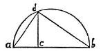 | Secta sit ab utcunque in c: dico, quadrata linearum mediarum inter totam ab et partes ac, cb, simul sumpta, aequalia esse quadrato totius ab.Id autem constat, descripto semicirculo super tota ba, et {299} ex c erecta perpendiculari cd, iunctisque da, db.Est enim da media inter ba, ac, estque db media inter ab, bc; suntque quadrata linearum da, db, simul sumpta, aequalia quadrato totius ab, recto existente angulo adb in semicirculo.Ergo patet propositum. | Let the line ab be cut at c. Then I say that the square of the mean proportional between ab and ac plus the square of the mean proportional between ab and cb is equal to the square of the whole line ab.This is evident as soon as we describe a semicircle upon the entire line ab, erect a perpendicular cd at c, and draw da and db.For da is a mean proportional between ab and ac while {299} db is a mean proportional between ab and bc: and since the angle adb, inscribed in a semicircle, is a right angle the sum of the squares of the lines da and db is equal to the square of the entire line ab.Hence follows the proposition. |