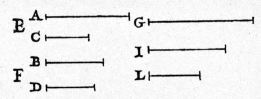 | Mota sint duo mobilia E, F motu aequabili, et ratio velocitatis mobilis E ad velocitatem mobilis F sit ut A ad B; temporis vero quo movetur E, ad tempus quo movetur F, ratio sit ut C ad D: dico, spatium peractum ab E cum velocitate A in tempore C, ad spatium peractum ab F cum {20} velocitate B in tempore D, habere rationem compositam ex ratione velocitatis A ad velocitatem B et ex ratione temporis C ad tempus D. Sit spatium ab E cum velocitate A in tempore C peractum G, et ut velocitas A ad velocitatem B, ita fiat G ad I; ut autem tempus C ad tempus D, ita sit I ad L: constat, I esse spatium quo movetur F in tempore eodem in quo E motum est per G, cum spatia G, I sint ut velocitates A, B.Et cum sit ut tempus C ad tempus D, ita I ad L; sit autem I spatium quod conficitur A mobili F in tempore C; erit L spatium quod conficitur ab F in tempore D cum velocitate B. Ratio autem G ad L componitur ex rationibus G ad I et I ad L, nempe ex rationibus {30} velocitatis A ad velocitatem B et temporis C ad tempus D: ergo patet propositum. | Let the two particles which are carried with uniform motion be E and F and let the ratio of the speed of the body E be to that of the body F as A is to B; but let the ratio of the time consumed by the motion of E be to the time consumed by the motion of F as C is to D. Then, I say, that the distance covered by E, with speed A in time C, bears to the space traversed by F with speed B in time D a ratio which is the product of the ratio of the speed A to the speed B by the ratio of the time C to the time D. For if G is the distance traversed by E at speed A during the time-interval C, and if G is to I as the speed A is to the speed B; and if also the time-interval C is to the time-interval D as I is to L, then it follows that I is the distance traversed by F in the same time that G is traversed by E since G is to I in the same ratio as the speed A to the speed B.And since I is to L in the same ratio as the time-intervals C and D, if I is the distance traversed by F during the interval C, then L will be the distance traversed by F during the interval D at the speed B. But the ratio of G to L is the product of the ratios G to I and I to L, that is, of the ratios of the speed A to the speed B and of the time-interval C to the time-interval D. Q. E. D. |