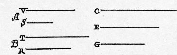 | Sint duo mobilia A, B, aequabili motu lata; sint autem spatia ab illis peracta in ratione V ad T, tempora vero sint ut S ad R: dico, velocitatem mobilis A ad velocitatem ipsius B habere rationem compositam ex ratione spatii V {10} ad spatium T et temporis R ad tempus S.Sit velocitas C ea cum qua mobile A conficit spatium V in tempore S, et quam rationem habet spatium V ad spatium T, hanc habeat velocitas C ad aliam E; erit E velocitas cum qua mobile B conficit spatium T in tempore eodem S: quod si fiat, ut tempus R ad tempus S, ita velocitas E ad aliam G, erit velocitas G illa secundum quam mobile B conficit spatium T in tempore R. Habemus itaque velocitatem C, cum qua mobile A conficit spatium V in tempore S, et velocitatem G, cum qua mobile B conficit spatium T in tempore R, et est ratio C ad G composita ex rationibus C ad E et E ad G; {20} ratio autem C ad E posita est eadem cum ratione spatii V ad spatium T; ratio vero E ad G est eadem cum ratione R ad S: ergo patet propositum. | Let A and B be the two particles which move at a uniform rate; and let the the respective distances traversed by them have the ratio of V to T, but let the time-intervals be as S to R. Then I say the speed of A will bear to the speed of B a ratio which is the product of the ratio of the distance V to the distance T and the time-interval R to the time-interval S. Let C be the speed at which A traverses the distance V during the time-interval S; and let the speed C bear the same ratio to another speed E as V bears to T; then E will be the speed at which B traverses the distance T during the time-interval S. If now the speed E is to another speed G as the time-interval R is to the time-interval S, then G will be the speed at which the particle B traverses the distance T during the time-interval R. Thus we have the speed C at which the particle A covers the distance V during the time S and also the speed G at which the particle B traverses the distance T during the time R. The ratio of C to G is the product of the ratio C to E and E to G; the ratio of C to E is by definition the same as the ratio of the distance V to distance T; and the ratio of E to G is the same as the ratio of R to S. Hence follows the proposition. |