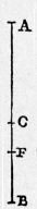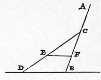 | Fiat latio per totam ab ex quiete in A, quae in C divisa sit utcumque; totius autem BA et prioris partis AC media sit proportionalis AF; erit CF excessus mediae FA super partem AC: dico, tempus lationis per AC ad tempus sequentis lationis per CB esse ut AC ad CF. Quod patet: nam tempus per AC ad tempus per totam AB est ut AC ad mediam AF; ergo, dividendo, tempus per AC ad tempus per reliquam CB erit ut AC ad CF. Si itaque intelligatur, tempus per AC esse ipsamet AC, tempus per CB erit CF: quod est {30} propositum. {230} Quod si motus non fiat per continuatam ACB, sed per inflexas ACD usque ad horizontem BD cui ex F parallela ducta sit FE, demonstrabitur pariter, tempus per AC ad tempus per reflexam CD esse ut AC ad CE. Nam tempus per AC ad tempus per CB est ut AC ad CF; tempus vero per CB post AC ad tempus per CD post eumdem descensum per AC demonstratum est esse ut CB ad CD, hoc est ut CF ad CE; ergo, ex aequali, tempus per AC ad tempus per CD erit ut AC linea ad CE. {10} | Let the fall take place, from rest at A, through the entire distance AB which is divided at any point C; also let AF be a mean proportional between the entire length BA and the first part AC; then CF will denote the excess of the mean proportional FA over the first part AC. Now, I say, the time of descent along AC will be to the time of subsequent fall through CB as the length AC is to CF. This is evident, because (Condition 2/02-th-02-cor2) the time along AC is to the time along the entire distance AB as AC is to the mean proportional AF. Therefore, dividendo, the time along AC will be to the time along the remainder CB as AC is to CF. If we agree to represent the time along AC by the length AC then the time along CB will be represented by CF. Q. E. D. {230} In case the motion is not along the straight line ACB but along the broken line ACD to the horizontal line BD, and if from F we draw the horizontal line FE, it may in like manner be proved that the time along AC is to the time along the inclined line CD as AC is to CE. (Condition 211a) For the time along AC is to the time along CB as AC is to CF; (Condition )210 but it has already been shown that the time along CB, after the fall through the distance AC, is to the time along CD, after descent through the same distance AC, as CB is to CD, or, as CF is to CE; therefore, ex aequali, the time along AC will be to the time along CD as the length AC is to the length CE. |