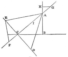 | Sint perpendiculum et planum inclinatum, quorum eadem sit {20} altitudo, AB, AC: oportet, in perpendiculo BA, producto ex parte A, punctum reperire, ex quo descendens mobile conficiat spatium AC eodem tempore, quo conficit datum perpendiculum AB ex quiete in A. Ponatur DCE ad angulos rectos ad AC, et secetur CD aequalis AB, et iungatur AD: erit angulus ADC maior angulo CAD (est enim CA maior quam AB, seu CD). Fiat angulus DAE aequalis angulo ADE, et ad ipsam AE perpendicularis {255} sit EF, plano inclinato et utrinque extenso occurrens in F, et utraque AI, AG ponatur ipsi CF aequalis, et per G ducatur GH, horizonti aequidistans: dico, H esse punctum quod quaeritur. Intelligatur enim, tempus casus per perpendiculum AB esse AB; erit tempus per AC ex quiete in A ipsamet AC: {10} cumque in triangulo rectangulo AEF ab angulo recto E perpendicularis ad basim AF sit acta EC, erit AE media inter FA, AC, et CE media inter AC, CF, hoc est inter CA, AI: et cum ipsius AC tempus ex A sit AC, erit AE tempus totius AF, et EC tempus ipsius AI. Quia vero in triangulo aequicruri AED latus AE est aequale lateri ED, erit ED tempus per AF: et est EC tempus per AI: ergo CD, {20} hoc est AB, erit tempus per IF ex quiete in A: quod idem est ac si dicamus, AB esse tempus per AC ex G, seu ex H: quod erat faciendum. | Let AB be the given limited vertical line and AC an inclined plane having the same altitude. It is required to find on the vertical BA, extended above A, a point from which a falling body will traverse the distance AC in the same time which is spent in falling, from rest at A, through the given vertical line AB. Draw the line DCE at right angles to AC, and lay off CD equal to AB; also join the points A and D; then the angle ADC will be greater than the angle CAD, since the side CA is greater than either AB or CD. Make the angle DAE equal to the angle {255} ADE, and draw EF perpendicular to AE; then EF will cut the inclined plane, extended both ways, at F.Lay off AI and AG each equal to CF; through G draw the horizontal line GH. Then, I say, H is the point sought. For, if we agree to let the length AB represent the time of fall along the vertical AB, (Condition 2/02-th-02-cor2) then AC will likewise represent the time of descent from rest at A, along AC; and since, in the right-angled triangle AEF, the line EC has been drawn from the right angle at E perpendicular to the base AF, it follows that AE will be a mean proportional between FA and AC, while CE will be a mean proportional between AC and CF, that is between CA and AI. Now, since AC represents the time of descent from A along AC, (Condition 2/02-th-02-cor2) it follows that AE will be the time along the entire distance AF, and EC the time along AI. But since in the isosceles triangle AED the side EA is equal to the side ED it follows that ED will represent the time of fall along AF, while EC is the time of fall along AI. (Condition 2/11-th-11) Therefore CD, that is AB, will represent the time of fall, from rest at A, along IF; which is the same as saying that AB is the time of fall, from G or from H, along AC. |